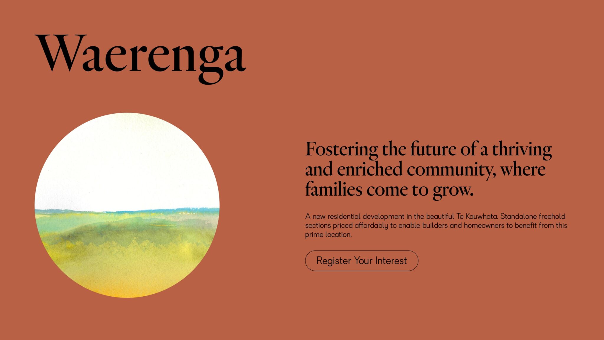 One-page website for a new residential subdivision located in Te Kauwhata, Waikato.